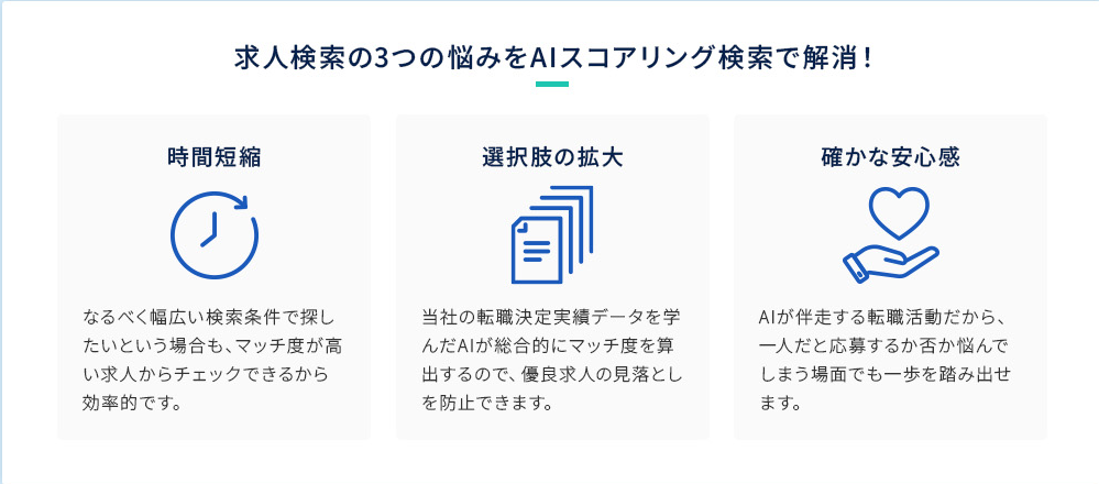 これまで自分にあっている求人なのかわからず、応募を躊躇していた求人については、客観的な実績データに基づくマッチ度を参照することで、自信を持って応募のアクションを起こすことができるようになります。
